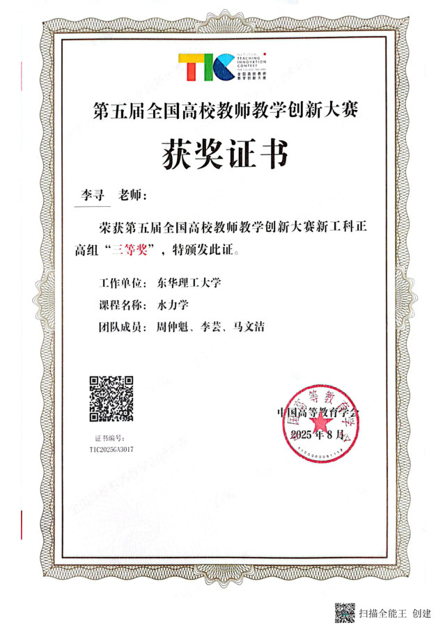 8月16日至19日,由教育部高等教育司指导、中国高等教育学会主办的第五届全国高校教师教学创新大赛在北京理工大学举行。东华理工大学水资源与环境工程学院李寻教师(团队)获新工科正高组三等奖。