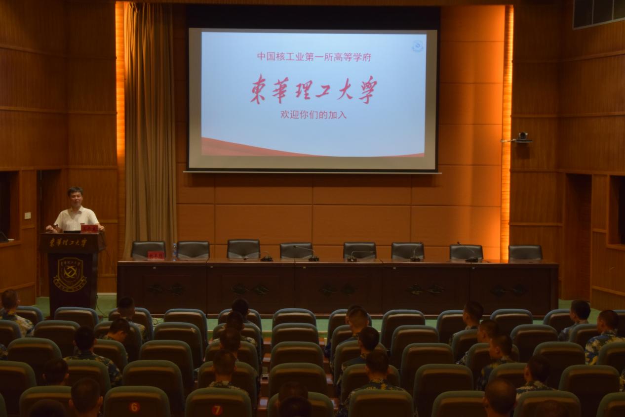 吕开云围绕“溯源核军工初心”“聚焦定向培养军士培养实践”“锚定海疆担当”三个核心维度展开讲授。“溯源核军工初心”部分,他重点回顾学校1956年建校以来“为核成立、因核成名、以核成势”的历程:强调学校作为“中国核地学人才摇篮”,以“国家利益至上”三迁校址、七易校名,累计输送27万余名人才,结合钱七虎院士引领、核资源与环境国家重点实验室等平台,让新生理解“核学”“地学”背后的国防担当。“聚焦定向培养军士培养实践”部分,他介绍学院“铁血铸军魂、铁拳谋打赢”育人体系:涵盖“四海”文化教育、红色走读等思想引领,科学组训、实战化军政锤炼等能力培养,以及与海军航空大学和北海舰队“军营+院校”协同机制;通过校运会冠军、“铸剑-2023”等赛事成果,详解“四建”机制与“四关”把控,让新生明晰培养流程。“锚定担当”部分,他结合学校“五个走前列”战略提三点要求:以刘刚烈士、胡珍、吴井泉、张延等毕业国防生为榜样厚植海疆情怀;参与专业实践、军政训练打牢“双基础”;锚定部队需求,以“四有”革命军人为目标,融入学校发展与海军建设。吕开云勉励新生:“以校史为镜、以标准为尺、以海疆为任,把认知转化为行动,早日成为合格定向培养军士!”(图/李豪杰 王忠林 陈志松 文/郭佳磊 曹益程 吴宇峰)