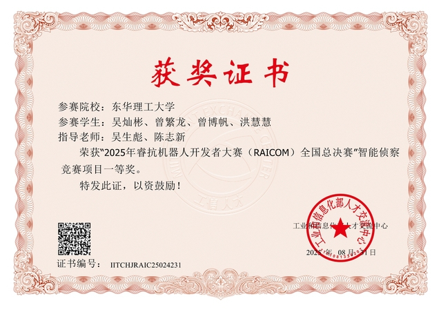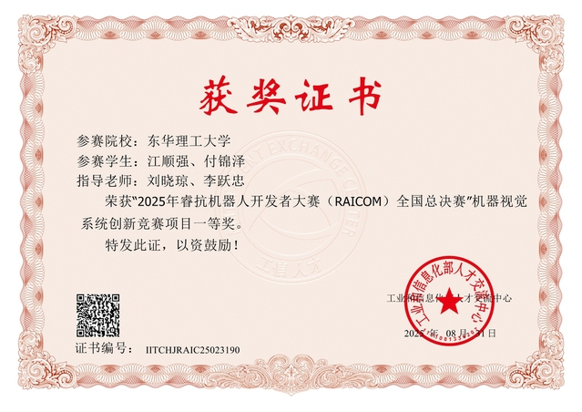 近日,由工业和信息化部人才交流中心、RoboCom国际公开赛组委会共同主办的2025年睿抗机器人开发者大赛CAIR工程竞技赛道在辽宁省沈阳市举行。东华理工大学电子与电气工程学院(智能制造学院)学生荣获国家一等奖3项、二等奖2项、三等奖4项。