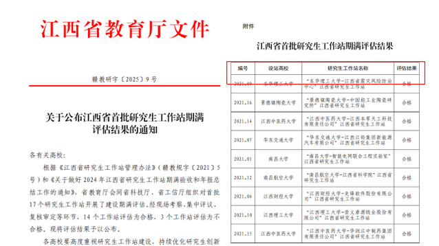 近日,江西省教育厅公布了首批研究生工作站期满评估结果,我校与江西省震灾风险防治中心共建的“东华理工大学-江西省震灾风险防治中心”江西省研究生工作站顺利通过验收,获评“合格”。