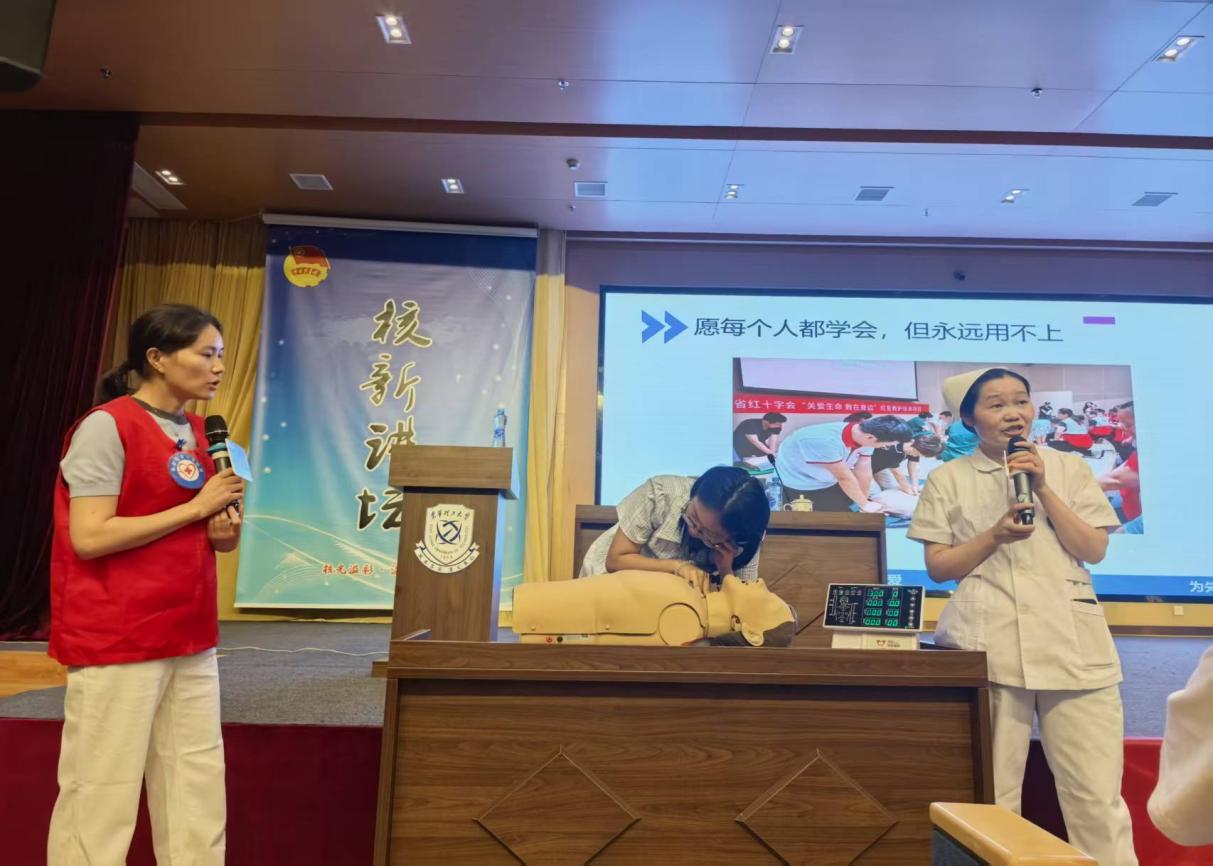 讲座中,黄茶英系统讲解了艾滋病传播机制、科学预防策略,纠正常见认知误区,并现场讲授艾滋病暴露应急处理、伤口规范处置流程。在实践操作环节,医护人员分步讲解并现场演示心肺复苏急救流程,并邀请同学们上台进行模拟操作,让抽象的急救知识变得直观可感。
