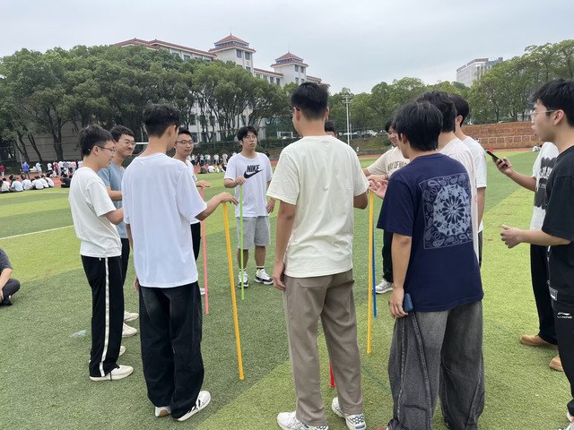 活动伊始,“不倒森林”率先登场,成为团队默契的“试金石”。10人一组的学子们手握长杆,在速度与方向的动态调整中反复磨合,从频繁失误到精准传接,无声的配合逐渐取代了初时的生疏。