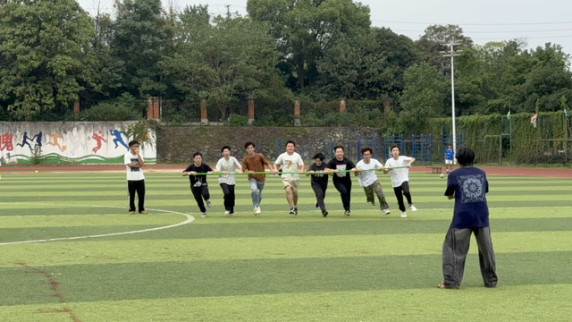 “旋风跑”将氛围推向热潮。各队手挽长绳如“旋风”穿梭赛场,绕杆转向时的齐声提醒、冲刺终点前的步伐统一,让“心往一处想、劲往一处使”的团队力量具象化。而压轴的拔河比赛更是点燃全场,绳索上的红线来回拉锯,场外啦啦队助威声震彻操场,学子们在胜负较量中淬炼出坚韧不拔的意志品质。