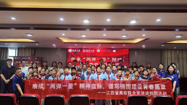 10月15日下午,东华理工大学、南昌大学、华东交通大学、南昌航空大学四校宣讲团在新庐小学教育集团广兰校区开展“传承‘两弹一星’精神,点亮青春强国梦想”为主题的宣讲。宣讲活动由南昌大学牵头组织。