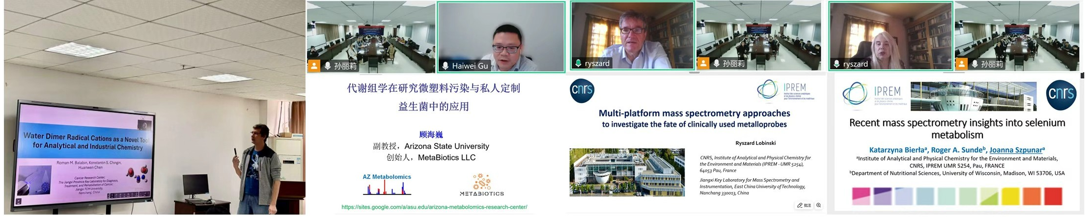 会上,学校名誉教授、法国国家科学研究中心Ryzsard Lobinski教授(波兰籍)和Joanna Szpunar教授(法国籍)分别作了题为《Multi-Platform Mass Spectrometry Approaches to Investigate the Fate of Clinically Used Metalloprobes and Their Proxies》和《Recent Mass Spectrometry Insights into Selenium Metabolism》的学术报告;美国亚利桑那州立大学 Haiwei Gu长聘副教授作了题为《Application of Metabolomics in the Study of Microplastic Pollution and Personalized Probiotics》的报告;中心合作专家俄罗斯籍Roman M. Balabin教授作了题为《Water Dimer Radical Cations as a Novel Tool for Analytical and Industrial Chemistry》的报告。此外,国际联合研究中心Jiaquan Xu, Xiaoping Zhang, Debo Wu等部分教师也围绕相关议题带来了精彩的学术报告。每场报告结束后,在场师生就报告内容展开了深入的交流探讨。