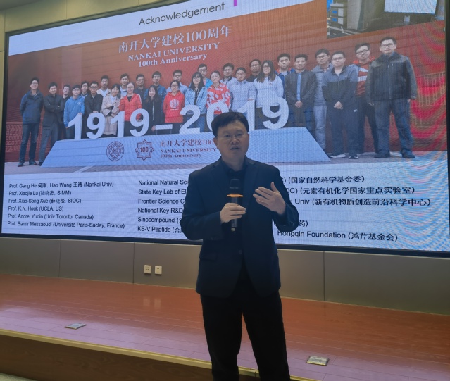 报告中,陈弓系统介绍其课题组在多肽环化领域取得的一系列创新成果。研究团队利用简单的醛类试剂,通过精准调控多肽中特定氨基酸残基的曼尼希及环化反应,实现了对多肽分子结构的高效、定向修饰与环化。该策略不仅显著提升了多肽的稳定性,还赋予了其新的生物功能,为多肽药物研发提供了新思路。陈弓还从反应机理角度深入解析了六氟异丙醇(HFIP)作为“质子梭”在反应中的关键作用,帮助师生更加透彻地理解其中的反应原理。