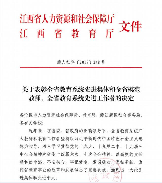 近日,江西省人力资源和社会保障厅、江西省教育厅表彰了一批省教育系统先进集体和省模范教师、省教育系统先进工作者,我校“核资源与环境”国家重点实验室荣获“全省教育系统先进集体”称号。