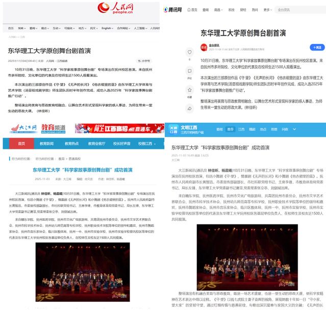 编者按:10月31日晚,东华理工大学“科学家故事原创舞台剧”专场演出在抚州校区首演。人民网、大江网、文明江西、腾讯新闻等主流媒体对此进行报道,引发社会广泛关注。现将原文转载如下: