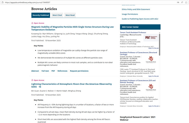 近日,东华理工大学地球物理与空间探测学院葛坤朋教授作为第一作者兼通讯作者,在国际权威地球科学期刊《Geophysical Research Letters》上发表了题为《Magnetic stability of magnetite particles with single vortex structure during low-temperature oxidation》的研究成果。该研究以东华理工大学为第一署名单位,联合爱丁堡大学(共同通讯作者Wyn Williams)、南方科技大学、利物浦大学等国内外高校合作完成。