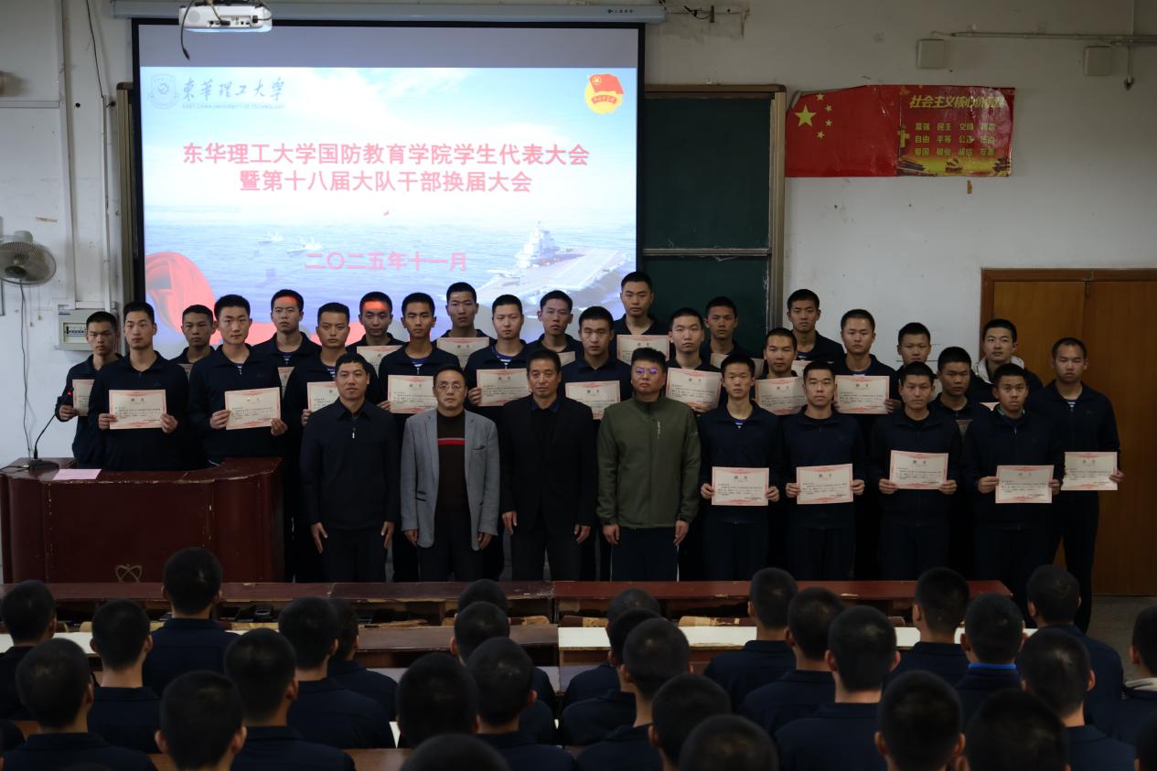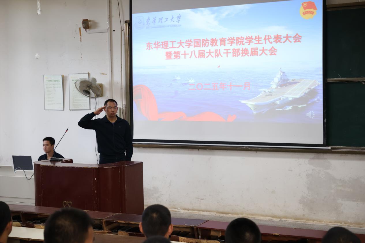 11月25日下午2时,国防教育学院在抚州学府校区信工楼阶六教室召开学生代表大会暨第十八届大队干部换届大会。学院党委书记赵克锋、组织员傅江辉、团委副书记郭佳磊、辅导员黄佳静、院第十七届大队干部及学生代表200余人参加此次大会。本次会议由郭佳磊主持。
