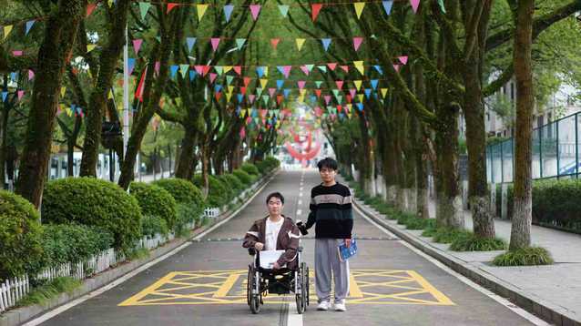 这双“翅膀”的故事,始于2023年9月的军训操场。何明剑注意到因行动不便而坐在轮椅上的麦海独自在场边,他没有犹豫,径直走上前发出了那个改变两人大学生活的邀请:“以后上下课、去食堂,我推你一起吧。”从此,校园的林荫道上,多了一对并肩同行的身影。