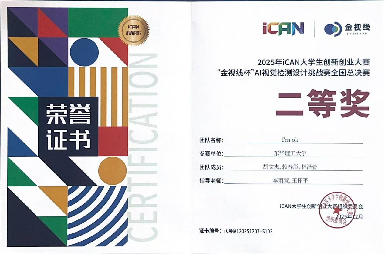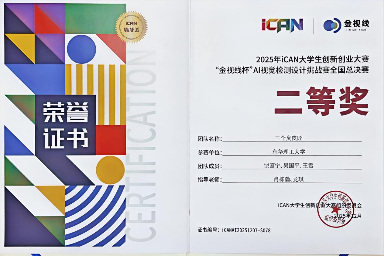 编者按:近日,东华理工大学电子与电气工程学院(智能制造学院)学生在2025年iCAN大学生创新创业大赛“金视线杯”AI视觉检测设计挑战赛全国总决赛中荣获二等奖2项。现将原文转载如下: