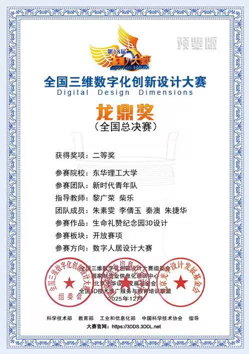 近日,2025年全国三维数字化创新设计大赛(以下简称“全国3D大赛”)获奖名单公布。东华理工大学地球与行星科学学院朱素雯、李倩玉等同学的作品《生命安息之所的3D规划》(指导老师:黎广荣、柴乐)获“龙鼎奖”(全国总决赛二等奖)。