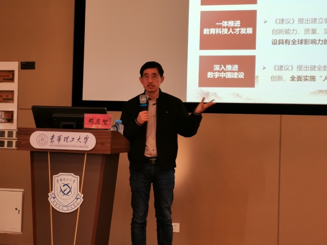 为深入学习宣传贯彻党的二十届四中全会精神,切实把师生的思想和行动统一到党中央决策部署上来,12月17日下午,东华理工大学党委常委、副校长邓居智在广兰校园四教阶20教室为分管联系单位师生作党的二十届四中全会精神专题宣讲。地球物理与空间探测学院、核科学与工程学院师生代表200余人参加了宣讲会。