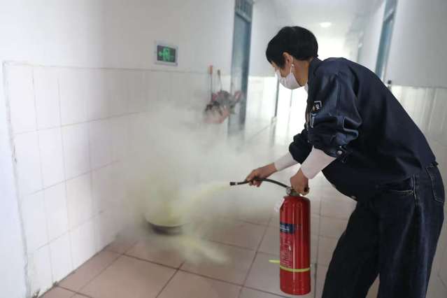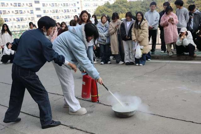 在实操环节,学院邀请了楼栋保安现场演示灭火与火情扑救。保安经过训练,完全掌握 “提、拔、握、压” 使用步骤。随后,同学们依次上前实操,从最初的略显紧张,到逐渐熟练掌握动作要领,成功将 “火情” 扑灭。同时,老师还针对宿舍内可能出现的电器起火、衣物起火等场景,演示了不同的应急处置方法,提醒大家切勿盲目用水灭火,避免引发触电或火势蔓延。