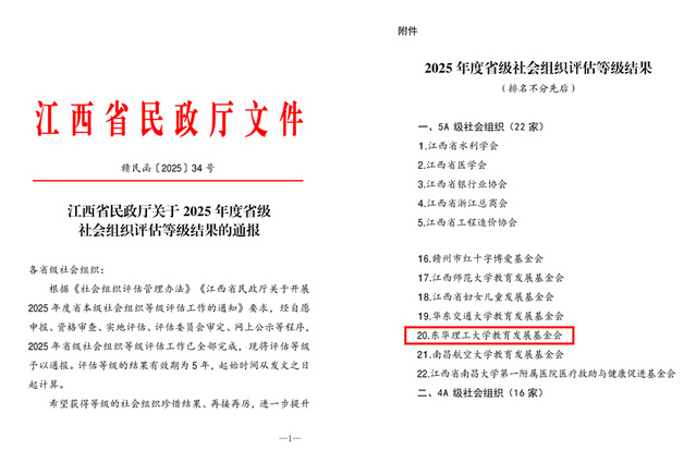 近日,江西省社会组织管理局公布了2025年度省本级社会组织等级评估结果,东华理工大学教育发展基金会(以下简称“基金会”)首次获评江西省社会组织规范化评估最高等级——5A级社会组织。