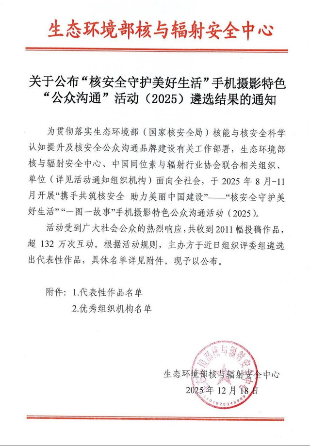 近日,生态环境部核与辐射安全中心公布了“核安全守护美好生活”手机摄影特色“公众沟通”活动(2025)遴选结果。东华理工大学获评优秀组织机构,文法学院曲有莹、罗小棕、欧阳兹怡三位同学的作品入选代表性作品名单。