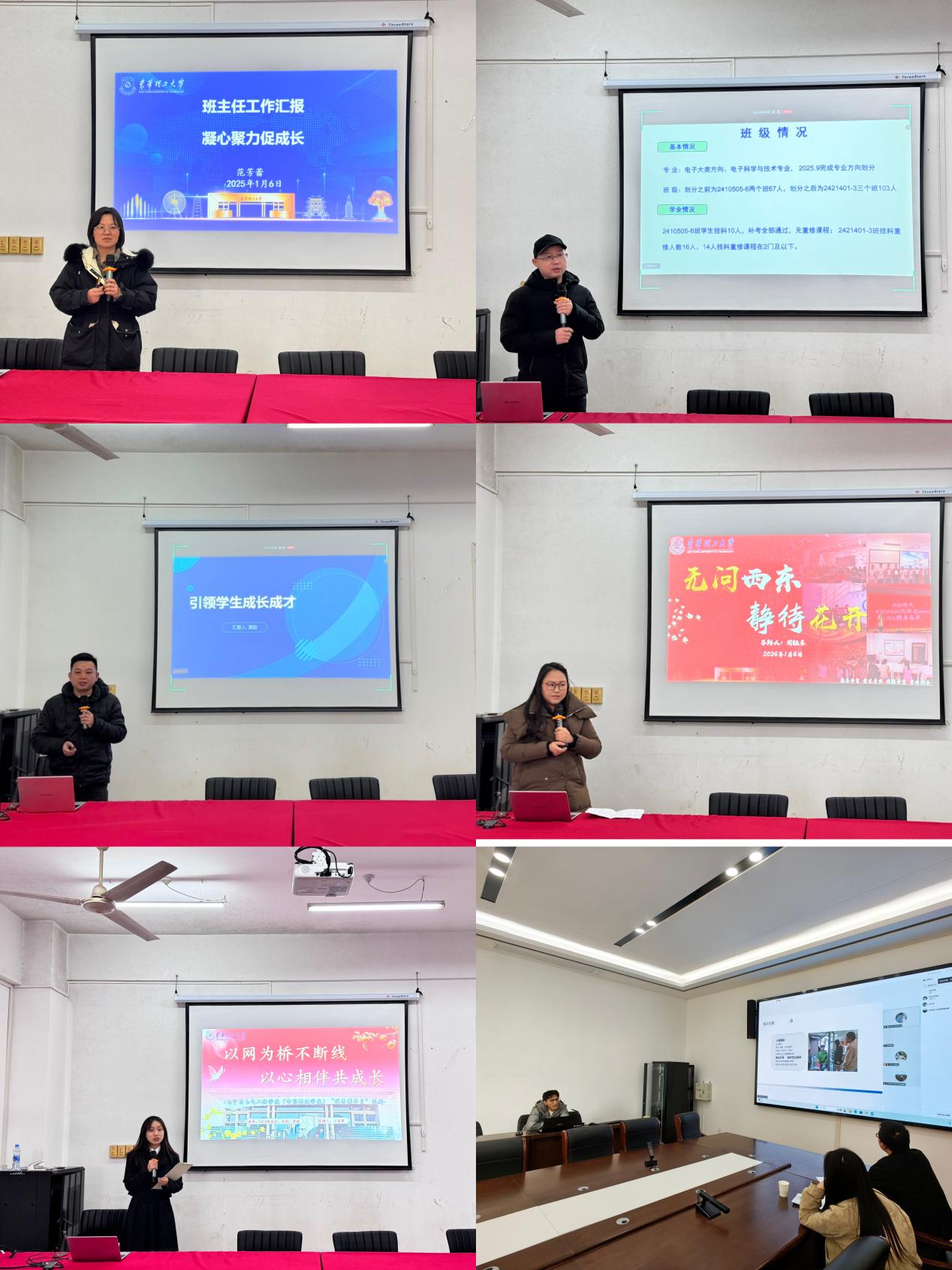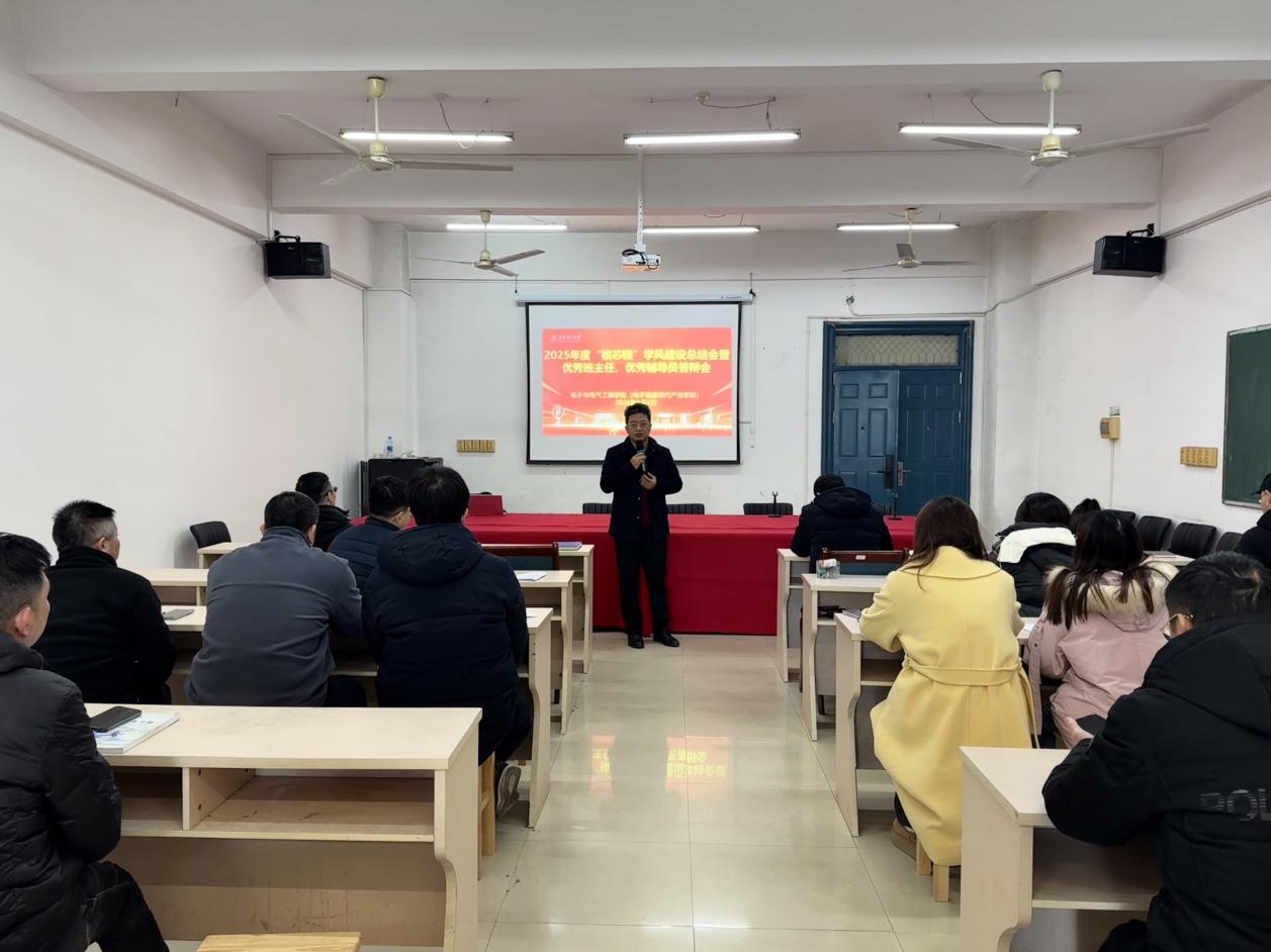 1月6日,电子与电气工程学院(智能制造学院)在机电楼301会议室召开“核芯链”学风建设总结会暨2025年度优秀班主任、辅导员答辩会。学院党政领导班子成员出席并担任评委,班主任以及辅导员到场观摩学习。