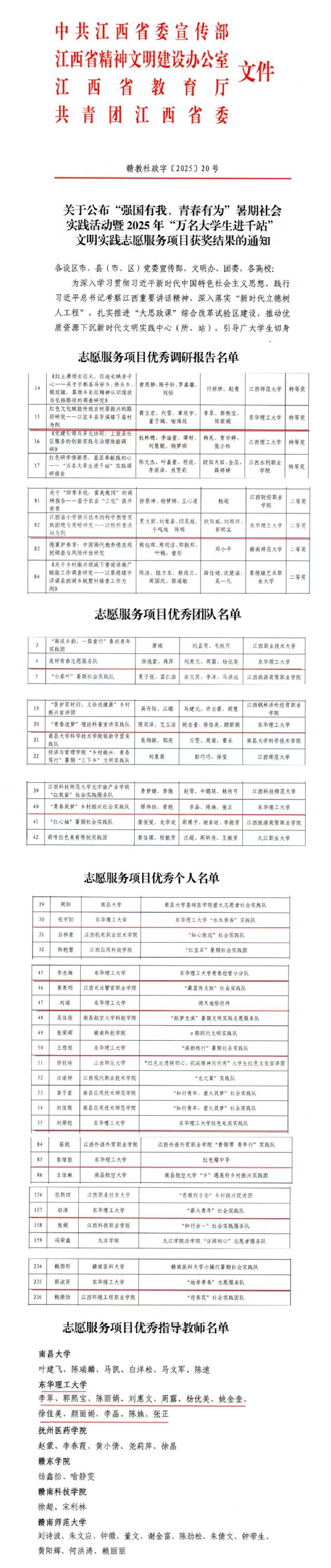 喜报!东华理工大学在“强国有我、青春有为”暑期社会实践活动暨2025年“万名大学生进千站”文明实践志愿服务项目中获多项省级表彰