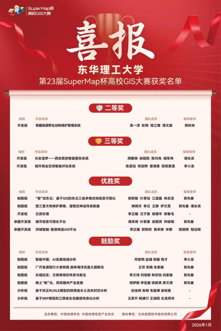 近日,由中国测绘学会和中国地理信息产业协会共同主办的“第23届SuperMap杯高校GIS大赛”落下帷幕。测绘与空间信息工程学院团队表现优异,荣获全国二等奖1项、三等奖2项。