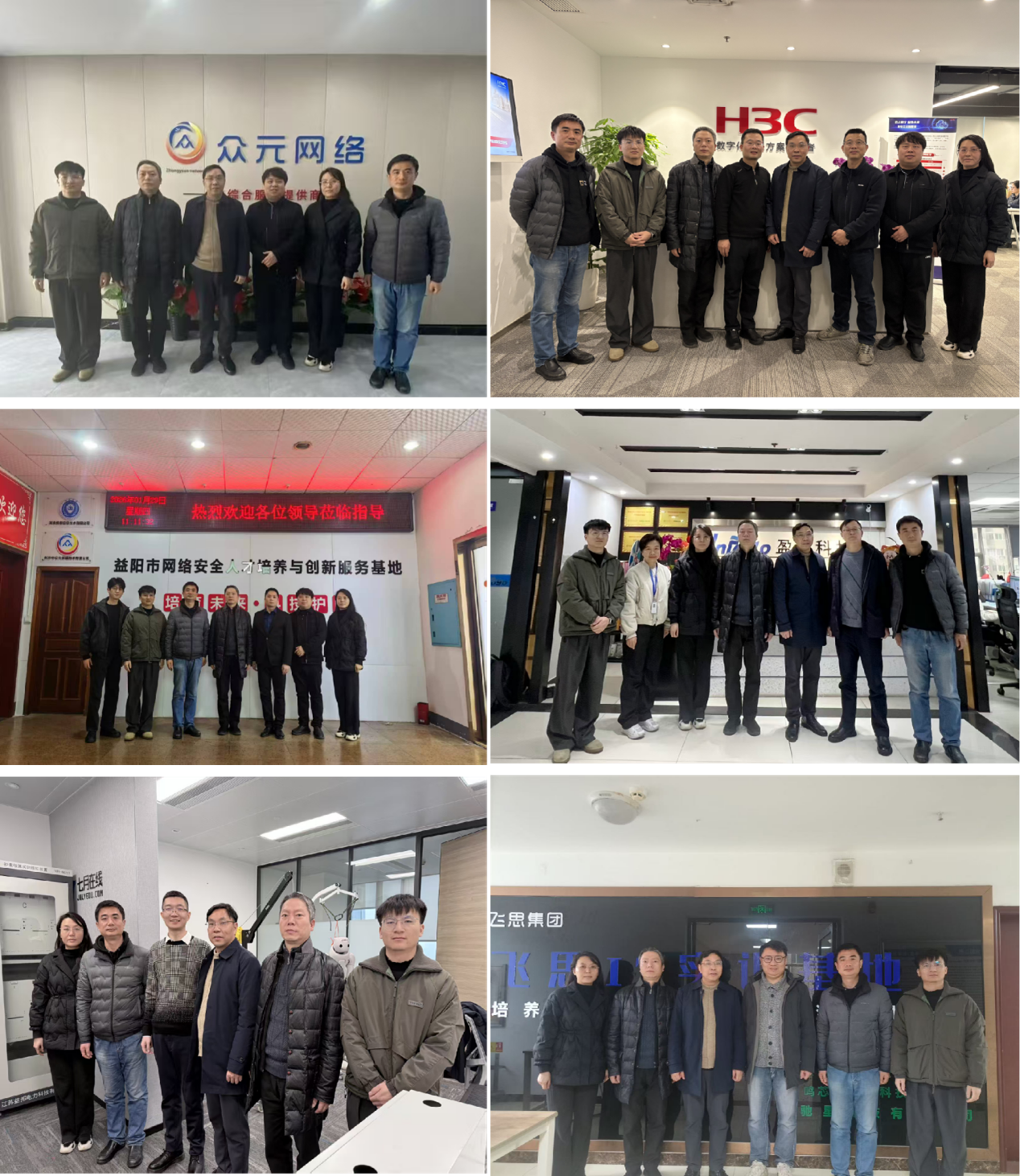 调研组先后走访了长沙市众元网络技术有限公司、新华三技术有限公司、益阳市网络安全人才培养与创新服务基地、杭州盈高科技有限公司(湖南分公司)、七月在线有限公司、湖南启智飞思信息科技有限公司等企业,实地考察了各企业的技术研发实力、人才梯队建设及核心岗位用人需求,详细介绍了学院的学科布局、人才培养特色与毕业生就业优势。双方围绕产教融合、人才定制培养、实习实训基地建设、学科竞赛共建等议题展开深入交流,精准对接企业岗位需求与学院人才培养方向,达成多项合作共识。