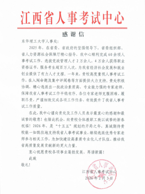 近日,江西省人事考试中心向我校人事处发来感谢信,充分肯定并诚挚感谢我校在过去一年中对全省人事考试工作提供的大力支持与重要贡献。