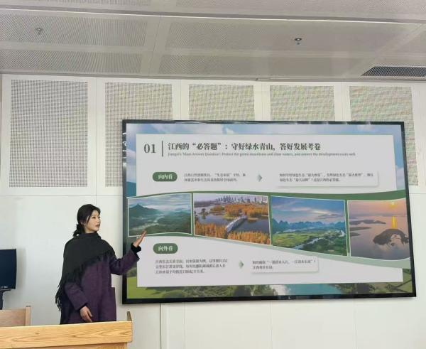 陈青走进江西宜春袁州学校五年级课堂,以“绿水青山就是金山银山”为主题,结合明月山、秀江水等本地景致开展互动宣讲,助力绘就“美丽中国”江西画卷,将绿色生态理念种进少年心间。