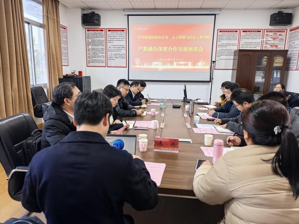 为深入推动树立和践行正确政绩观学习教育走深走实,3月18日下午,学院与中国移动通信集团江西有限公司抚州分公司校企合作交流会议在软件楼313会议室成功举行。双方围绕人工智能专业建设、企业资源对接、人才共育、产教深度融合、学生实习就业以及产学研协同资源整合等议题进行了深入探讨,旨在推动产教深度融合,协同培育符合产业需求的高素质人才。中国移动通信集团江西有限公司抚州分公司总经理魏星、副总经理龙毅,公司相关部门负责人何婧、何利群、王峰、危江,学院党委书记王平风及相关专业负责人出席座谈会。会议由学院副院长张军主持。