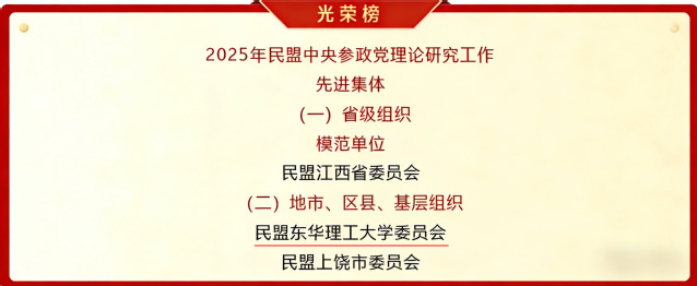 3月17日,民盟参政党理论与盟史研究工作会议在江西南昌召开,会议对2025年度民盟参政党理论研究先进单位、盟史研究先进集体及民盟参政党理论和盟史研究先进个人进行了表彰。民盟东华理工大学委员会获参政党理论研究先进集体称号。这是民盟东华理工大学委员会第八次荣获民盟中央表彰,也是换届以来连续第五年获得民盟中央表彰。