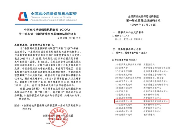 近日,全国高校质量保障机构联盟(CIQA)公布首届联盟成员及其组织结构,我校当选为首届常务理事单位。