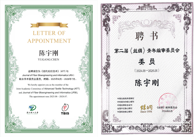 为共同推动纺织生物工程及信息学等领域的学术交流和知识传播,建设国际化期刊平台,近期《现代纺织技术》(ATT)与英国纺织领域重要学术期刊《Journal of Fiber Bioengineering and Informatics》(JFBI)联合组建ATT&JFBI中英双刊联合编委会,诚邀国内外相关领域专家、卓越学者加入联合编委会。经个人申请、编辑部初审、会议遴选及编委会审议等严格流程,该联合组织于近期公布了ATT&JFBI中英双刊首届联合编委会成员,我院陈宇刚教授继受聘CSCD核心、北大核心《丝绸》期刊青年编委之后,再次成功受聘为联合学术委员会委员,同时担任两刊的编委或学术编辑。