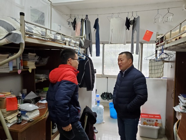 宿舍安全检查主要针对学生留校情况和宿舍用电安全、疏散通道、物品堆放等易发隐患进行了排查,对发现的问题及时整改并做好记录,以便跟踪反馈。在学生宿舍,马建国与同学们进行了交流,嘱咐留宿学生要加强假期出行安全和防范意识,妥善保管好自己的财物,尤其是贵重物品;离校时要记得切断电源和关好门窗,同时要求学生回到家后要在第一时间向辅导员和班主任报平安。