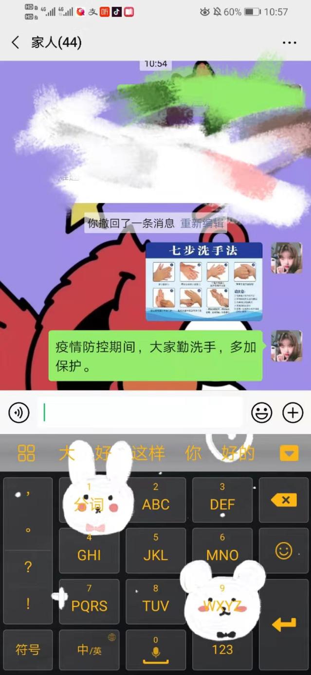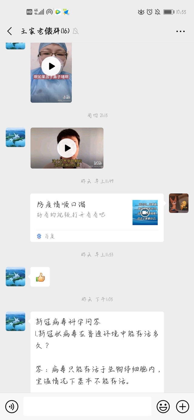 学院要求全体学生作为家庭防疫宣讲员或网络防疫志愿者,从各大官网的新闻中选取疫情防控素材进行转发,并拍摄制作正确戴口罩、洗手等相关卫生知识小视频转发到朋友圈、家庭微信群、同学QQ群等。还积极转发学校、学院防疫的相关信息,科普疫情相关知识。