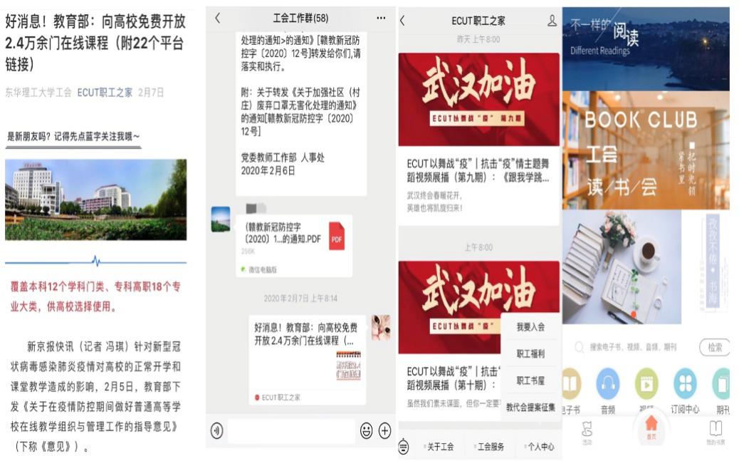 疫情防控期间,校工会密切关注着教职工的身心健康,为保障广大教职工以更加平和理性的心态应对此次新型冠状病毒肺炎疫情,校工会通过在ECUT职工之家微信公众平台打造云学习平台——“职工书屋”,为职工们焦虑情绪的舒缓调解,提供了良好的途径,使之更加坚定战胜疫情的信心。2月7日,校工会通过ECUT职工之家平台发布《好消息!教育部:向高校免费开放2.4万余门在线课程(附22个平台链接)》,线上开展了“抗击疫情,与书同行”网上免费阅读活动。通过这一活动,给居家防疫的职工网友一个新的场域,让心情平静下来,以阅读的方式赋予自己知识的力量。