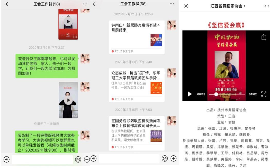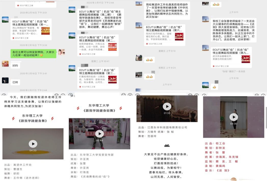 为认真贯彻落实习近平总书记对新型冠状病毒疫情做出的重要指示精神,响应聚焦疫情防控主题创作的号召,校工会面向全校公开征集“抗击疫情”舞蹈公益作品,短短一周时间就收到各部门、各学院师生以及校友60多件原创作品投稿。2月16日开始通过ECUT职工之家微信公众号发布《ECUT以舞战“疫”|抗击“疫”情主题舞蹈视频展播:<跟我学跳健身舞>》,在病毒疫苗还未研发成功的时候,提升免疫力无疑是我们防病毒、抗病毒的最好方式,为了让师生足不出户,方便室内练习,我校离退休工作处、体育学院、艺术学院、机电学院、东华科技园等单位的老师紧急创编了一系列适合大众居家锻炼的教学视频供大家线上学习。目前已推出了十余期由我校教师自己创编的教学视频。