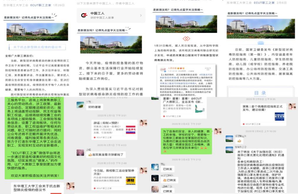 当前疫情防控工作正在全面推进,防控力度持续加大,但疫情形势依旧严峻,校工会于2020年1月29日通过ECUT职工之家微信公众号发布《东华理工大学工会关于抗击新型肺炎疫情的倡议书》,并将倡议书通过工会工作微信群、QQ群转发致各位教职工,倡议全校教职工统一思想和行动,有序参与疫情防控,扎实做好舆论引导等工作,充分发扬各二级工会、工会干部和广大教职工主人翁精神,全力打好疫情防控阻击战。及时向广大教职工宣传、解读权威机构发布的疫情防控相关政策与防疫知识30余次,同时要求各二级工会主动转发,做好疫情防控的宣传、引导工作。
