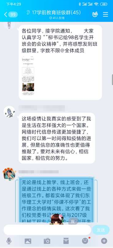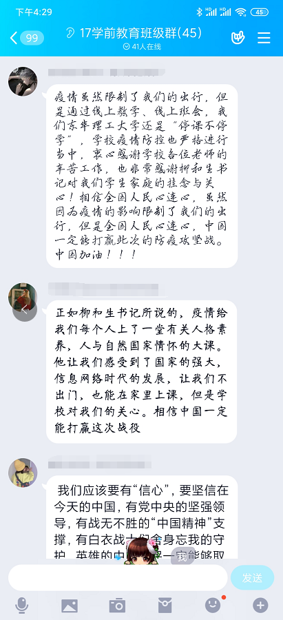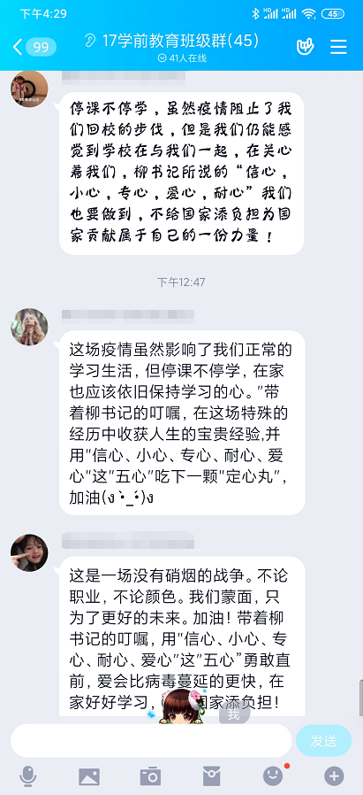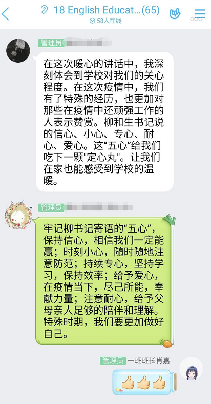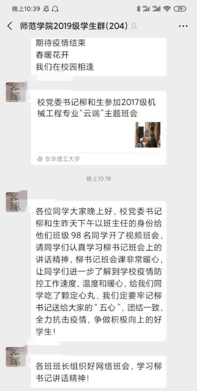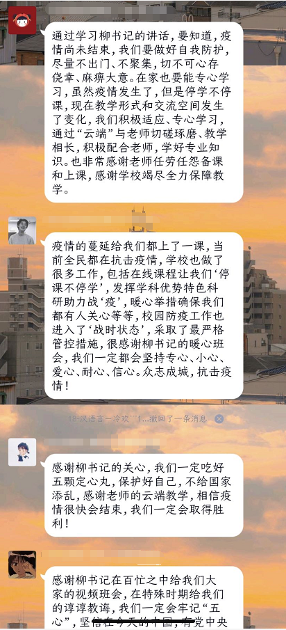 柳书记在召开班会时,表达了对学生们的关心和慰问以及通过“五心”来叮嘱同学们要在疫情防控之余,沉着应对,重新思考此次疫情中的个人收获。据了解,各班同学们纷纷发表感想:感谢柳书记对学生们的挂念及关心,感谢学校老师们的辛苦工作,每个人都将牢记柳书记提出的“五心”,并认真贯彻实施,用“信心、小心、专心、耐心、爱心”勇敢直前,服从学校的安排,做到“停课不停学”,绝对不荒废学业,重返校园之日,大家都将以最好的状态相聚。更有同学说到:虽然疫情阻挡了我们回学校的步伐,但每个人都深深感受到学校始终与我们在一起,关心着我们,很温暖。