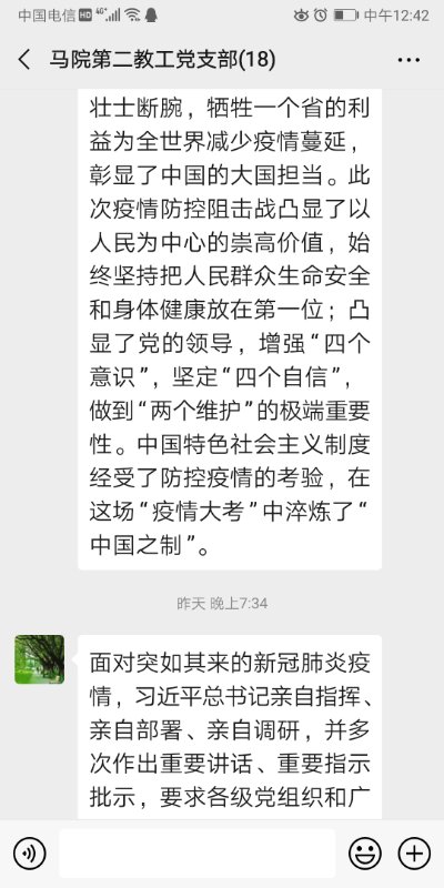 为积极应对新冠肺炎疫情新形势,近日,马克思主义学院党总支通过微信群组织教工党员、发展对象和入党积极分子深入学习贯彻习近平总书记关于疫情防控的重要讲话和一系列重要指示批示精神,确保疫情防控和线上教学两手抓、两不误、两促进。