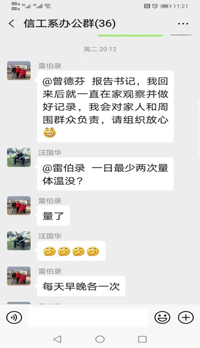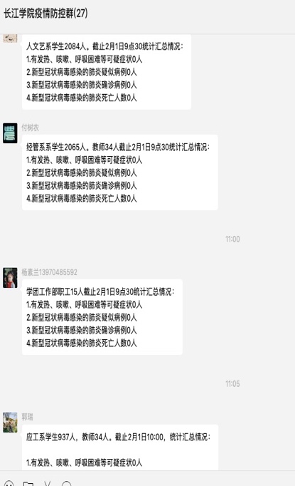 从1月26日起,学院汇总报送省、市、校级等上级部门各级各类防疫数据、文件1000多份。党政办公室亓云老师说,“我就在校内住,进不了校园同志的值班,全部我来值吧”。盛丽华老师说,“每天我要收齐每一位师生的疫情统计情况,知道全部正常,一个不缺,我这一天心里才会踏实……”截止目前,全院7482师生,无一例感染。