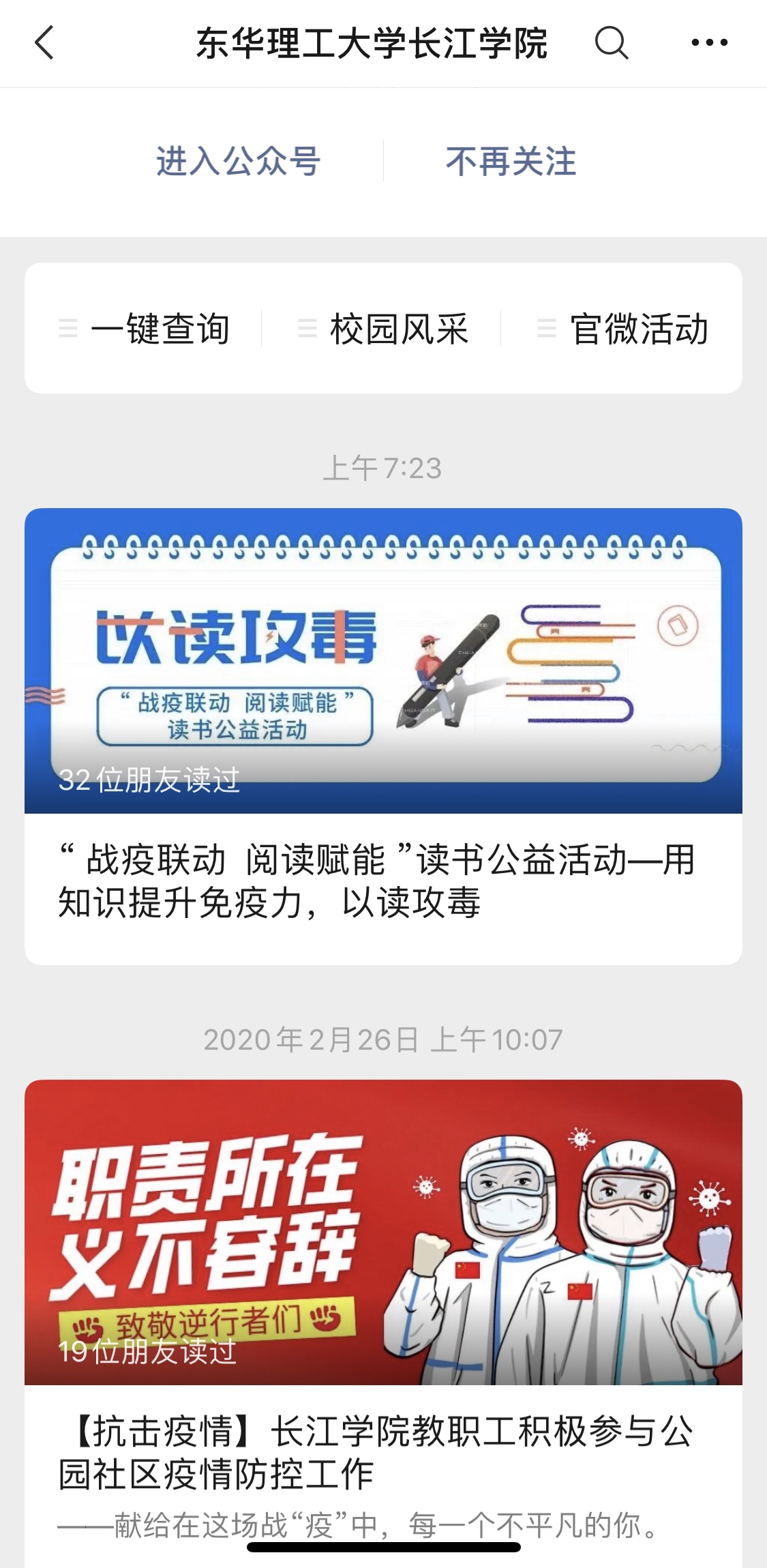 学院官方微信公众号从“疫情防控”“关注学生”“先锋堡垒”“心理疏导”等方面,发布《长江学院疫情防控工作专项部署》《预防新冠病毒—致全院师生的一封信》《关于“废弃口罩别乱丢”的倡议书》《隔离疫情不隔离爱》《东华理工大学长江学院学子抗“疫”战斗c位出列》《在线不掉线、师生齐连线,东华理工大学长江学院线上教学稳步进行》《拉起社区抗疫“防护线”——记东华理工大学长江学院教工志愿小分队》等23篇推文,其中多篇推文被江西新闻等省级媒体聚焦刊载。学团公众号发布《我是战“疫”青年志愿者》系列推文,发出《拒绝野味、善待动物,敬畏自然》系列倡议,号召和教育广大学生青年积极应对正面疫情,凝聚人心。在战役的后方,讲好战“役”前线故事,凝心聚力,共战疫情。