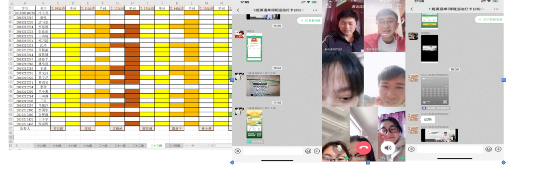 2017级辅导员梁朝曦通过QQ群召开网络主题班会,号召同学们要积极掌握疫情状况和防疫知识,调整和摆正疫情当前的心态,快速适应网络教学,安心线上学习,增强学习自觉性,保持乐观心态,理性面对疫情,为抗击疫情贡献力量。2018级辅导员李磊在疫情期间,通过qq、微信等方式,深入掌握学生的身心状况和线上上课情况,及时解决学生线上学习存在的问题,同时加强纪律约束,要求学生严格遵守课堂纪律。除了关注疫情期间学生的身心状况,他通过年级新媒体平台向学生推送居家健身运动视频,指导学生们在疫情期间加强身体锻炼,提高身体免疫力。2019级辅导员郭炜阳引导学生开展个人职业生涯规划设计,对上一学期的学习、生活情况做一次全面梳理,结合学生自身目标,制定一份个人成长发展规划。她指导学生们不仅制定了计划,还制定了作息时间表,明确每天和每周的学习任务,使学生们掌握近期目标和任务,更增强了获得感和自信心。