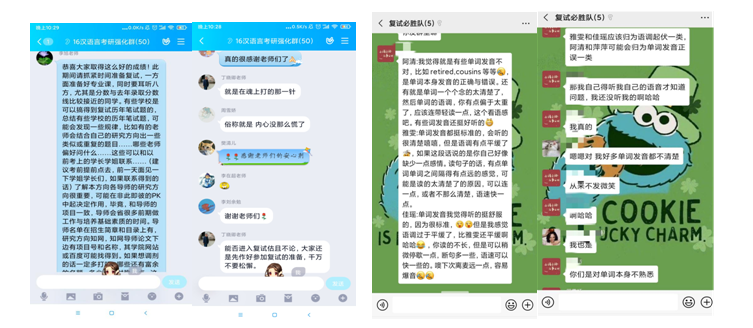 由于疫情影响,正在准备考研复试的毕业班学生不能返校学习,只能在家中备考,但大部分学生存在手边复习资料不齐全的问题。为了缓解准备复试考生们的焦虑、迷茫情绪,2016级汉语言文学专业班主任丁晓卿及时统计考生考研成绩,第一时间掌握情况,并组建qq群——“16汉语言考研强化群”,邀请相关指导老师与备考生们进行键对键交流。指导老师们在群中为备考生们答疑解惑,分享考研经验与最新资讯,加强了学生们的学习热情,营造了良好的学习氛围。2016级辅导员陈燕充分把握学生考研动态和心理状态,制作考研初试情况统计表,根据学生成绩和心理特点进行深入分析。她鼓励已通过研究生初试的学生们进行“抱团式”学习,指导学生们集中练习、相互点评、共享学习资料,并及时为学生们做好心理疏导,正确对待考试,缓解在家备考压力。