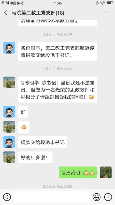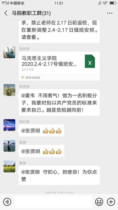 “作为一名入党积极分子,我要时刻以共产党员的标准来要求自己。越是危险越向前。”这是学院入党积极分子张贤明在疫情期间主动承担学院值班任务时所言。面对疫情,学院入党积极分子积极向党组织靠拢,以实际行动彰显初心使命。在抗击疫情捐款活动中,学院入党积极分子张贤明、钟睿、郝云红、周红艳主动捐款,以实际行动践履初心。正如他们所言,“虽然我还不是党员,但作为一名光荣的思政课教师和积极分子请组织接受我的捐款。”在承担的本学期思想政治理论课教学任务中,入党积极分子认真备课,及时向大学生讲好中国战“疫”故事。江西省高校“战疫思政课堂”教学比赛通知公布后,学院入党积极分子积极报名参赛,并表示要认真准备此次教学比赛,展现马克思主义学院教师的风采。 (文/段艳丰)