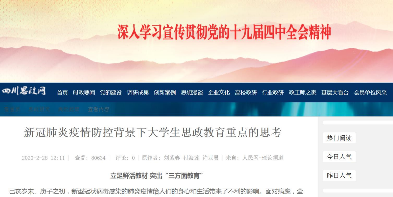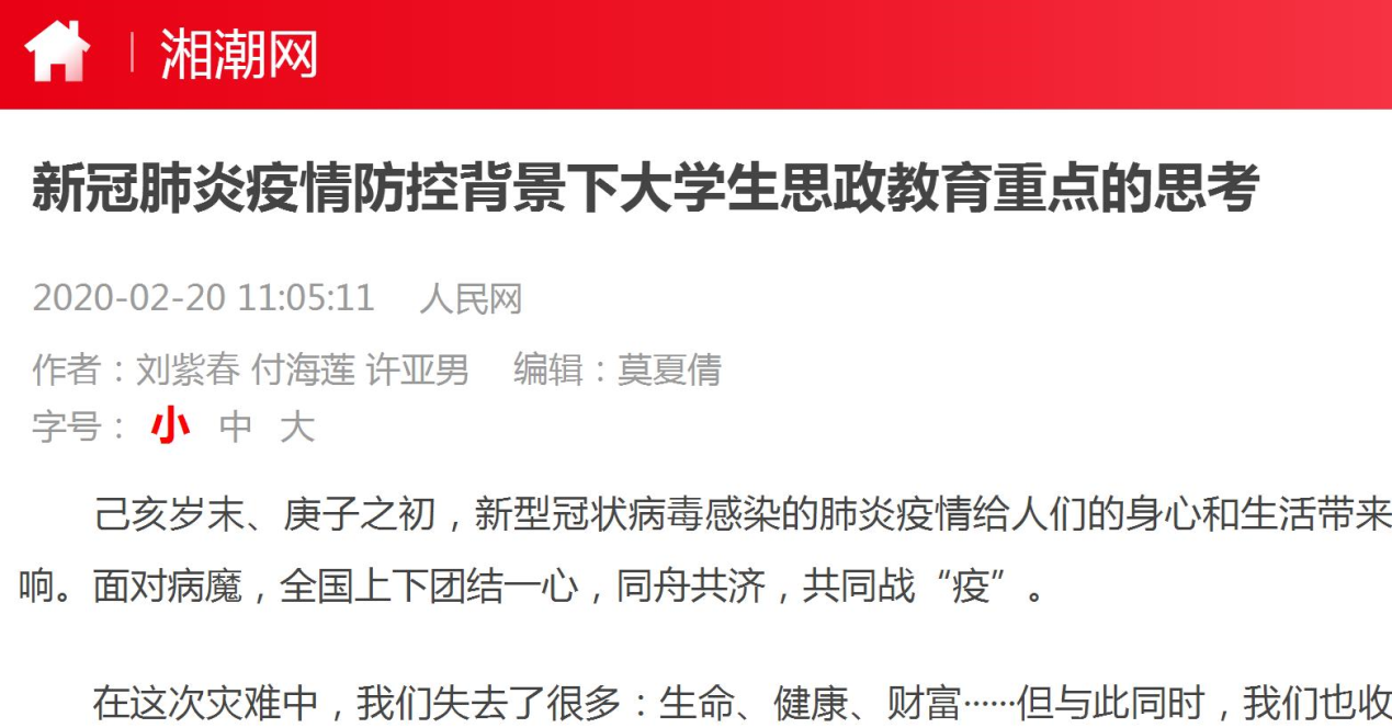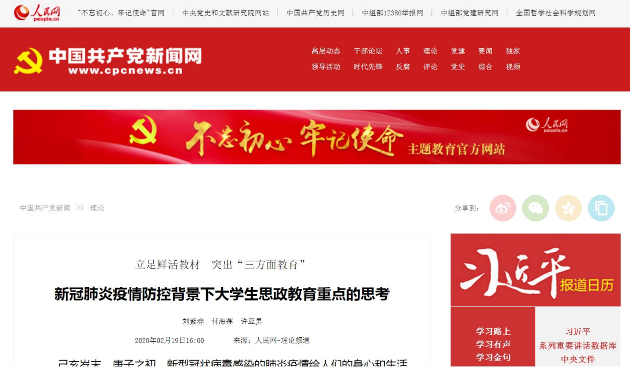 编者按:近日,我校党委副书记、马克思主义学院硕士研究生导师刘紫春教授等人撰写的理论文章——《立足鲜活教材 突出“三方面教育”——新冠肺炎疫情防控背景下大学生思政教育重点的思考》在人民网理论频道刊登,同时被多家媒体转载。现将全文转发如下: