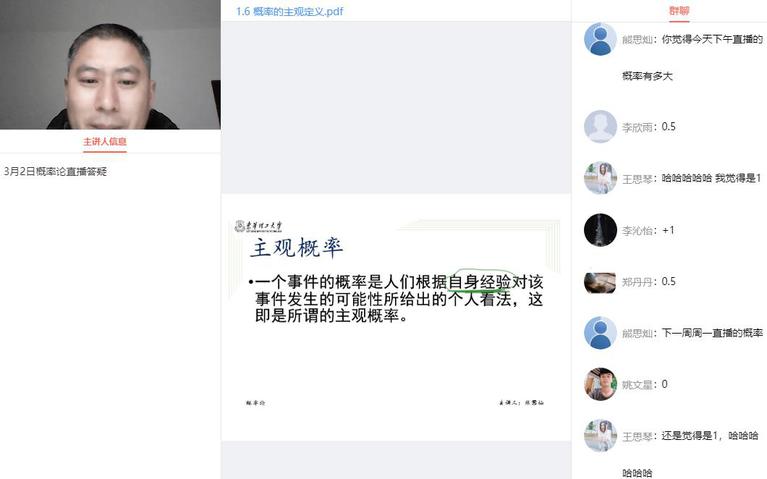 以上对话是理学院统计系熊思灿老师在《概率论》直播串讲中讲到“主观概率”时发生的场景。原本应该发生在教室中的欢声笑语,现在却隔空通过文字来表达。这就是“战役”当前,熊老师的《概率论》直播课堂——以一种近似“概率”的玩法来讲授“概率”的知识。