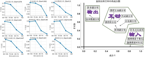 2018年9月,《概率论》迎来了它的首次移动教学改革。如何能够让同学们的学习潜能得到充分挖掘? 这是自移动教学改革以来,熊老师一直在探索的问题。他通过数据分析,走访调查等各种手段,获得了大量反应同学们学习效果的相关指标。这些指标包括但不限于:在线考试成绩,作业成绩,课程访问数,讨论发帖、回帖数,视频观看时长,任务点完成比例,课程互动得分,签到率,以及课程积分等等。熊老师通过2019-2020学年第1学期的概率论课程期末考试成绩与前述指标的相关性分析以及因子分析发现,这些指标大致可以归结为三类,即学习输入(如任务点完成情况),学习输出(如作业完成情况),以及教学互动(如讨论完成情况)。