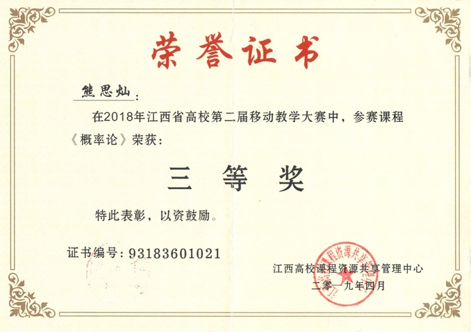 熊老师正是秉持着这种兢兢业业的钻研精神,在《概率论》的移动教学改革道路上坚韧地前行着。2019-2020学年的第1学期的第二轮移动教学实践中,熊老师凭借“线下为主、线上为辅、全员参与”的移动教学模式,让18级统计专业同学的《概率论》期末考试成绩获得了大幅度提升,平均成绩高达79.35分,且85分至100分的同学占了全班80人的40%,出现了十分明显的差转好,好转优,优转特的局面。此外,熊老师的移动教学改革,也获得了相关机构和部门的认可,并被选作为优秀案例向全国教师分享。如2019年获得了江西省高校第二届移动教学大赛三等奖的荣誉。2020年2月,熊老师受邀在超星平台为全国一线教师,开展了“疫情面前:双重视角下的教与学”培训等等。