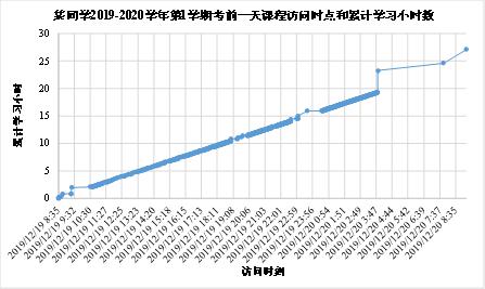 通过更为细致的分析,熊老师发现,在线课程的访问数据是一个衡量同学们学习效果的至关重要的指标。在线课程访问数据,往往受到其他各种指标的影响。比如同学们点开资源学习,需要登录网站,从而产生登录性的访问数据。而同学们为了复习备考,需要长时间不间断地学习,从而产生持续学习性访问数据。曾经在2019至2020学年第1学期有一位同学,从考试前1天 (2019年12月19日) 早上8:35分开始,持续学习到了考试当天 (2019年12月20日) 的凌晨3:53分,总共持续学习时长高达19.3小时,非常地罕见。