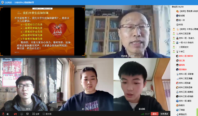 课堂开始,余修日亲切向同学们“问好”,并给群里的女生们送上一份迟到的节日祝福。他首先给同学们分享了当前我国抗击疫情的个人体会,从身边事例出发,表达了对最美逆行者——白衣天使、最美身影——普通公民和最美工程师——建设工人等抗疫一线工作人员的赞许和钦佩;从武汉封城到火神山和雷神山医院的落成,及时有效的防控布局,诠释了“中国速度”和“中国力量”,我们这些抗击疫情的做法,得到了世界许多国家元首赞许,这体现了中国制度的优越性,也充分展现了中国人民众志成城、共抗疫情的战斗精神。