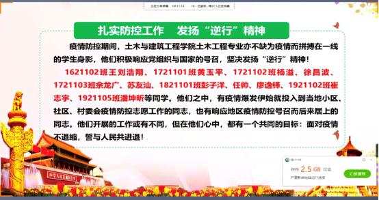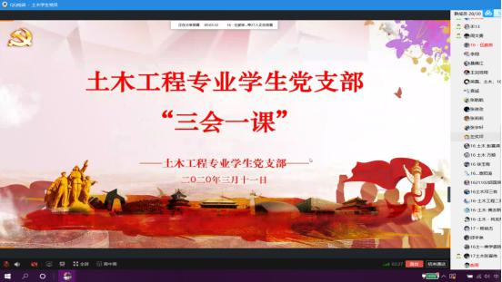为响应上级党委号召,确保防控疫情工作正常进行,同时支部活动及制度正常执行,土木与建筑工程学院土木工程专业学生党支部于2020年3月11日晚19:00开展线上“三会一课”会议。土木与建筑工程学院土木工程专业学生党支部全体党员参与会议,会议由学生党支部书记杨文瑞老师主持。